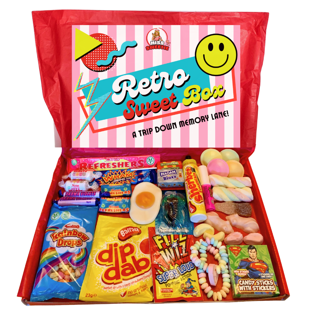 Our Retro Sweet Boxes packed with all your childhood favourites. From fizzy cola bottles and flying saucers to sherbet fountains and candy necklaces, each box is a joyful throwback to simpler times.